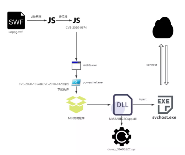 Purple Fox,又称“紫狐”,是一个于2018年9月被首次观察到,在2019年曾使用过NSIS(Nullsoft Scriptable Install System)和Rig漏洞利用攻击工具包,后来转而采用PowerShell来实现无文件执行。本次发现的新变种利用了CVE-2020-0674的IE远程代码执行漏洞、CVE-2018-8120和CVE-2020-1054两个Win32k.sys提权漏洞,并且利用了Dll类型的白文件进行新一轮的网络攻击。