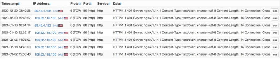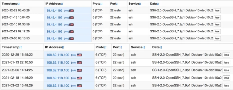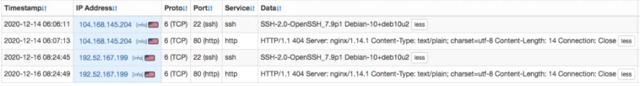在2020年12月期间获得了两个IP地址的标语信息,在端口TCP/22和TCP/80上显示了相同的字符串。