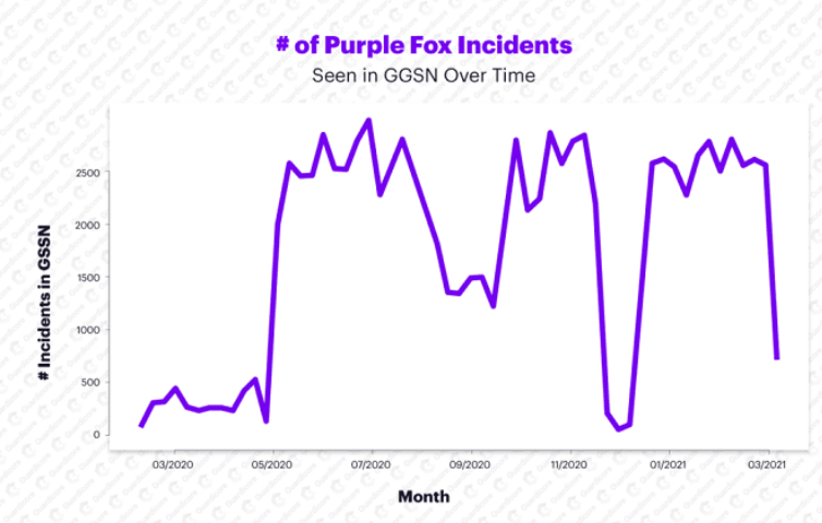 由于自身传播的能力较强,蠕虫僵尸网络对受害者造成的风险也更大。相较于此前的网络钓鱼和漏洞利用工具包,蠕虫感染技术的“运营成本”也更低。根据监测数据,自 2020 年 5 月以来,Purple Fox 的感染率已飙升 600%,且实际数量可能会更高(过去一年总计超过 90000 感染)。