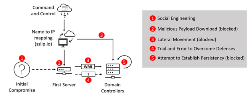 在进行网络侦察之后,FIN8组织通过使用用于远程代码执行的 WMIC 实用程序(内置的 Windows 工具)进行横向移动。成功横向移动后,攻击者试图在选定的服务器上建立持久性。WMIC ( wmic.exe) 用于创建远程命令提示 ( cmd.exe),然后执行 PowerShell 代码。PowerShell 命令创建了两个变量,并尝试从 FIN8 的C&C服务器下载和执行有效负载。最后,命令行尝试执行从 IP 地址104[.]168[.]237[.]21下载的代码。攻击者滥用 sslip.io 连接到 C&C,使 SSL 证书生成更容易进行流量加密。虽然该服务是合法且被广泛使用的,但恶意软件会在连接到 C&C 服务器时滥用它以逃避检测。研究人员表示,企业必须提高预防能力(以减缓攻击并生成早期指标)和检测和响应能力以阻止FIN8组织的攻击。