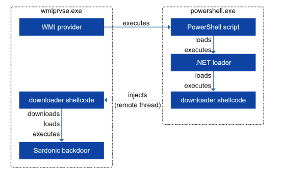 Sardonic后门是用c++编写的,具有与下载程序shellcode相同的C&C服务器,并通过端口 443 进行通信。Sardonic后门不仅可以在受感染的机器上实现特权驻留,还可以获取关于系统的信息和执行命令,传输到远程攻击者控制的服务器。Sardonic后门还具有加载并执行附加插件的功能。FIN8组织在进行横向移动和特权提升以部署Sardonic负载之前,已经渗透到目标网络进行详细侦察,但恶意命令行被阻止。Sardonic后门执行流程如下: