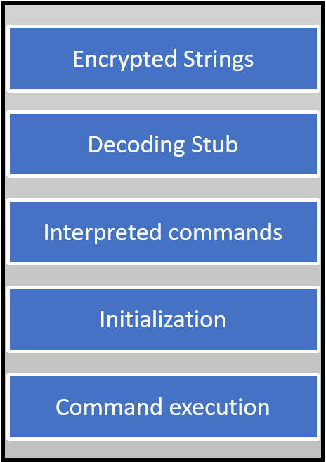 此次攻击活动感染始于与银行交易相关的恶意网络钓鱼信息,伪装成 PDF 文件。这个新变种比以前的版本具有更复杂的混淆级别,增强了反分析能力。恶意代码的高层结构如下图: