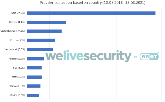 自 2018 年以来,研究人员已识别出数百个部署了 888 RAT 的 Android 设备实例。下图展示了该检测数据的国家分布: