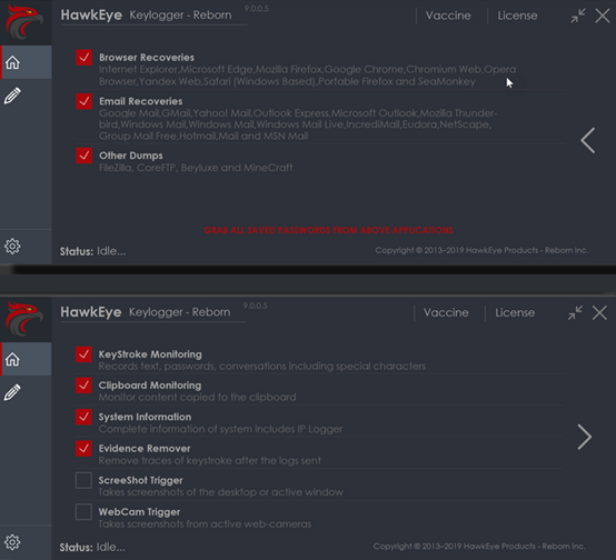 作为窃密程序,支持的窃密配置有剪贴板监控,截屏,浏览器信息盗取等,危害十分巨大: